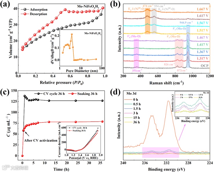 图3 a) Mo-NiFeOxHy的N2吸附-解吸等温线和孔径分布。b) 电化学原位拉曼。c)两种不同方式活化后样品的ICP测试。d) 高分辨率Mo 3d XPS在不同时间。