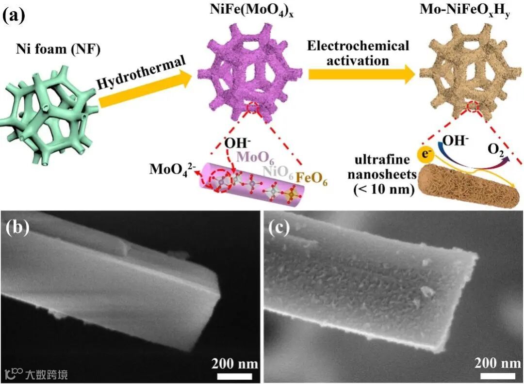 图1结果表明:通过简单的水热法在泡沫镍(NF)上原位生长掺Fe的NiMoO4纳米棒(NiFe(MoO4)x),然后,使用循环伏安法(CV)对合成的NiFe(MoO4)x进行活化,在电化学活化过程中,钼酸盐离子MoO42-逐渐溶解,同时电解液中的氢氧根离子(OH-)扩散到前驱体中,并与Ni2+和Fe3+离子反应以生产超细NiFeOxHy(氧)氢氧化物纳米片(<10 nm)。