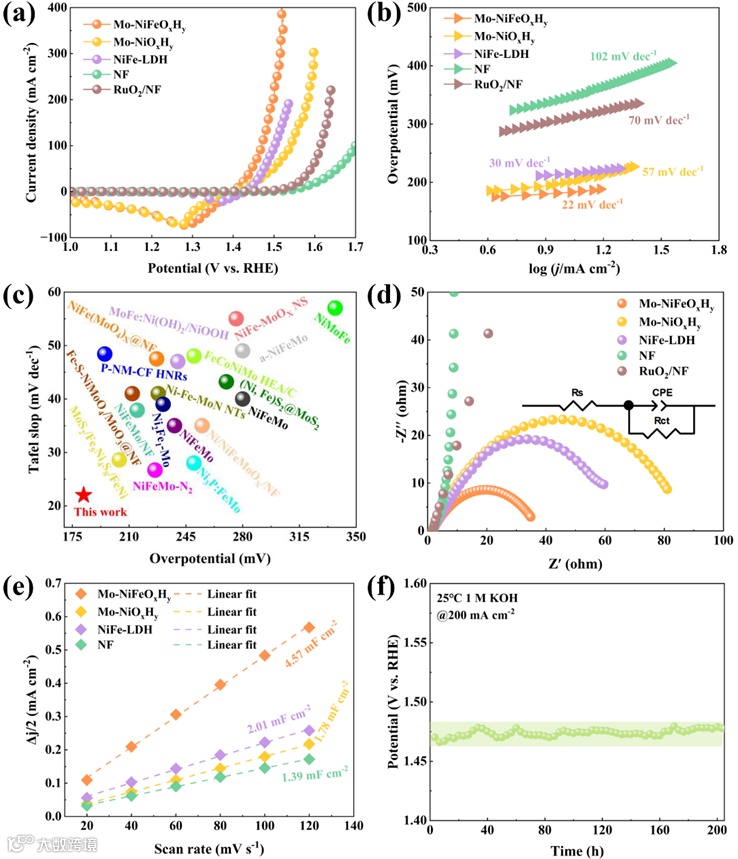 图6催化剂的OER性能。a) 不同催化剂的LSV, b) 塔菲尔斜率, c) Mo-NiFeOxHy的塔菲尔斜率与过电势和已报道催化剂的比较, d) 奈奎斯特曲线, e) 催化剂的双电层电容Cdl, f) Mo-NiFeOxHy的稳定性测试。