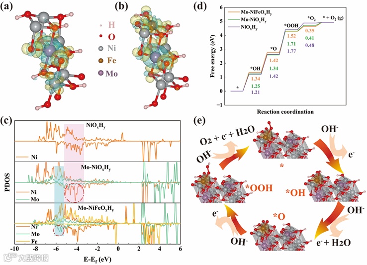 图7 a) Mo-NiOxHy和b) Mo-NiFeOxHy的差分电荷密度。c) NiOxHy, Mo-NiOxHy和Mo-NiFeOxHy态密度。d) NiOxHy, Mo-NiOxHy和Mo-NiFeOxHy在OER反应过程中的吉布斯自由能图。e) OER的路径示意图。