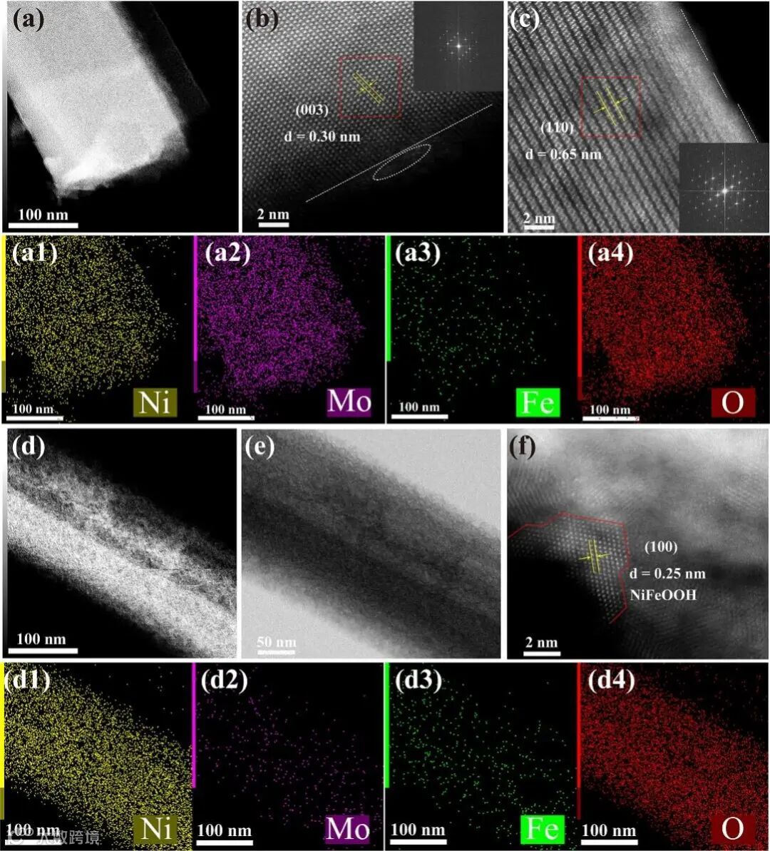 图2 a-c) NiFe(MoO4)x的HAADF-STEM图像。a1-a4) NiFe(MoO4)x中的Ni、Mo、Fe和O元素分布。d-f)Mo-NiFeOxHy的HAADF-STEM图像。d1-d4) Mo-NiFeOxHy中Ni、Mo、Fe和O元素分布。