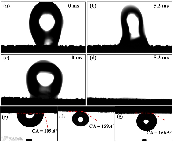 图4表面润湿性和气泡释放行为。表面润湿性照片:a, b) NiFe(MoO4)x,c, d)Mo-NiFeOxHy。气泡/催化剂接触角照片在电解质下:e) NF,f) NiFe(MoO4)x,和g) Mo-NiFeOxHy。
