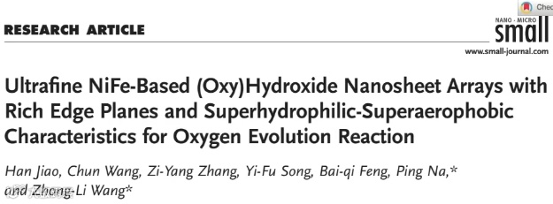 针对上述问题,天津大学那平研究员与王中利教授合作,在国际知名期刊Small上发表题为“Ultrafine NiFe-Based (Oxy)Hydroxide Nanosheet Arrays with Rich Edge Planes and Superhydrophilic-Superaerophobic Characteristics for Oxygen Evolution Reaction”的研究论文。
