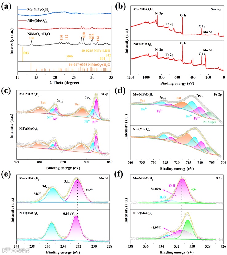 图5 a) NiMoO4、NiFe(MoO4)x和Mo-NiFeOxHy的XRD图谱。b) XPS全谱分析,c) Ni 2p XPS光谱,d) Fe 2p XPS谱,e) Mo 3d XPS以及f) O1s XPS光谱。