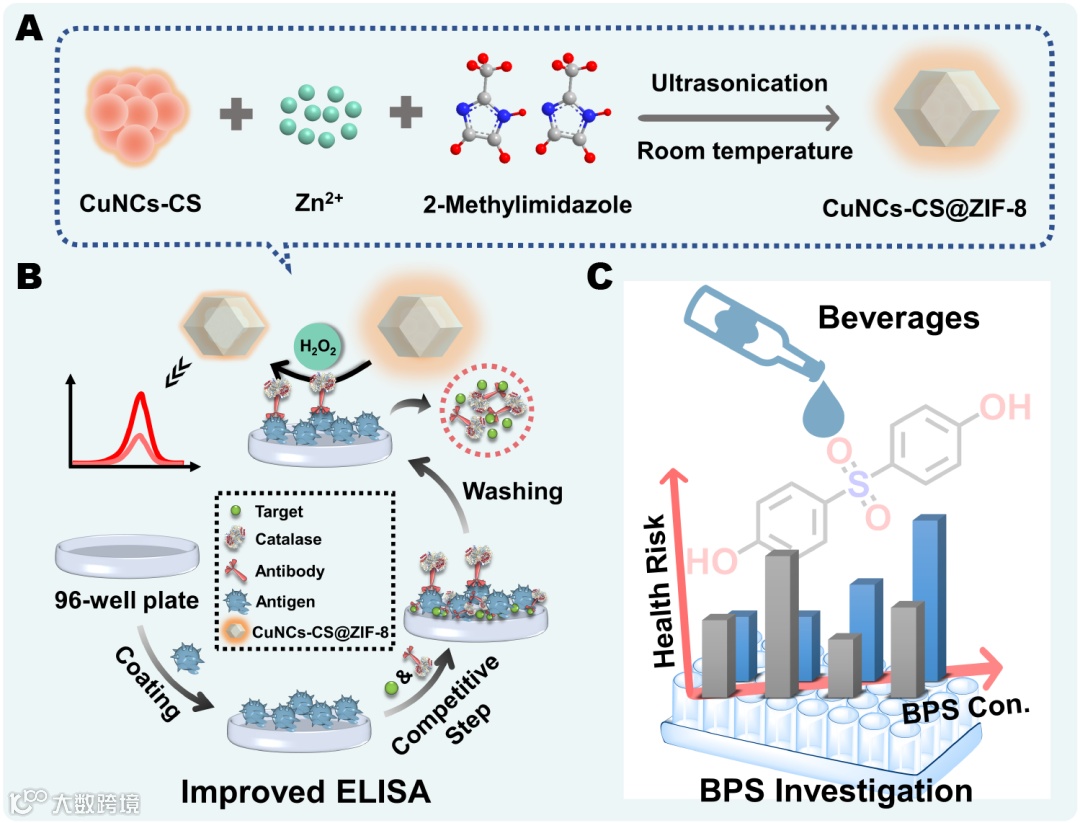 Figure 1. Principle of CuNCs-CS@ZIF-8-based immunoassay for BPS detection and investigation. (A) Mechanism for the preparation of CuNCs-CS@ZIF-8; (B) Process of this proposed immunoassay based on CuNCs-CS@ZIF-8; (C) BPS Investigation and health risk assessment.