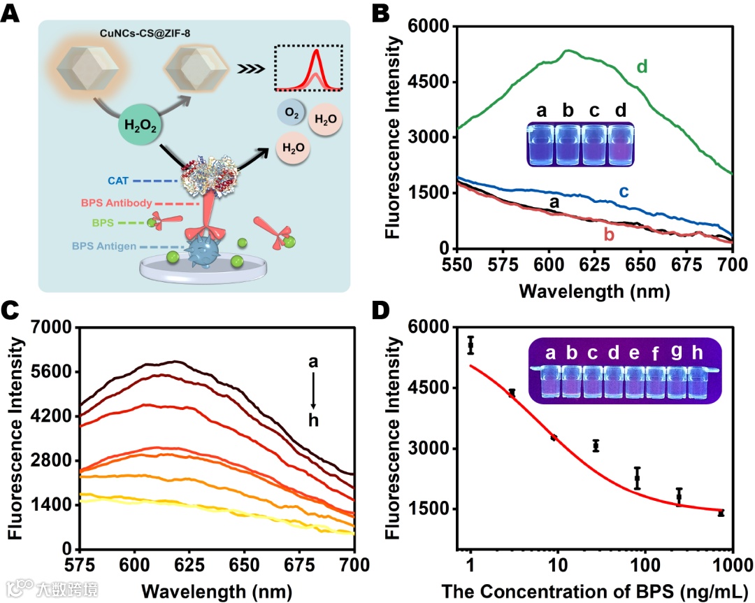 Figure 3. Development of CuNCs-CS@ZIF-8-based FELISA for BPS detection. (A) Schematic illustration of this proposed ELISA using CuNCs-CS@ZIF-8 as the probe; (B) Fluorescence spectra of final solutions after incubation with (a) blank, (b) CAT@Ab, (c) CAT + antigen, (d) CAT@Ab + antigen; (C) Fluorescence spectra of CuNCsCS@ZIF-8 as BPS concentrations increased from 0.9717 to 34.65 ng/mL; (D) Calibration curve of fluorescence intensity towards different concentrations of BPS.