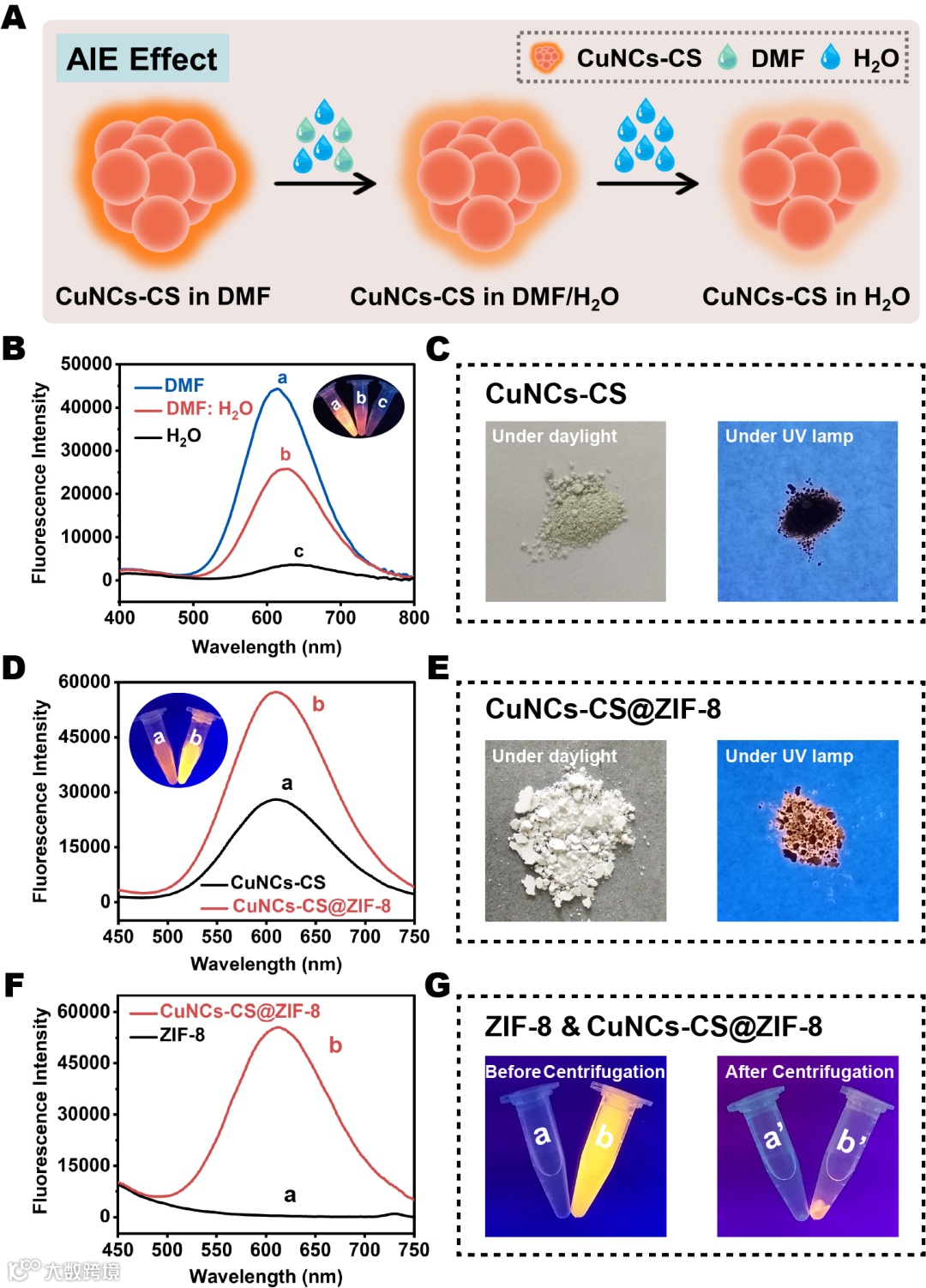 Figure 2. Fluorescence properties of CuNCs-CS@ZIF-8. (A) Schematic illustration of AIE effect; (B) Fluorescence spectra of CuNCs-CS in DMF with the water proportion of (a) 0%, (b) 50%, and (c) 100%, inset: photographs of CuNCs-CS in different solutions under UV lamp; (C) Photographs of CuNCs-CS under daylight and UV lamp; (D) Fluorescence spectra of (a) CuNCs-CS and (b) CuNCs-CS@ZIF-8; inset: photographs of CuNCs-CS and CuNCs-CS@ZIF-8 under UV lamp; (E) Photographs of CuNCs-CS@ZIF-8 under daylight and UV lamp; (F) Fluorescence spectra of (a) ZIF-8 and (b) CuNCs-CS@ZIF-8; (G) Photographs of (a)/(a′) ZIF-8 and (b)/(b′) CuNCs-CS@ZIF-8 before and after the centrifugation.