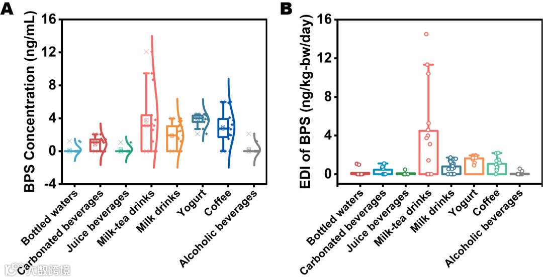Figure 4. Results analysis of BPS pollution in different beverage samples. (A) Concentrations of BPS in different beverage samples. The box plot shows the range from 25th (bottom edge of the box) to 75th percentiles (top edge of the box), and the line within the box is median concentrations. The low and up whisker represents the 5th and 95th percentiles, respectively. The crosses in lower and upper positions are 1st and 99th percentiles. The arithmetic mean of BPS concentrations in various beverages is labeled as the closed square. These curves in various color dots are normal distribution curves; (B) EDI values of BPS in different beverage samples. The box plot represented the arithmetic mean of EDI values in each kind of beverage.