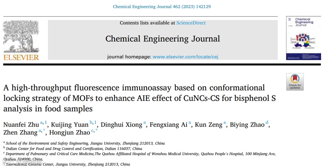 基于此,温州医科大学附属衢州医院赵红军副主任医师、江苏大学张祯教授合作在国际知名期刊Chemical Engineering Journal上发表题为“A high-throughput fluorescence immunoassay based on conformational locking strategy of MOFs to enhance AIE effect of CuNCs-CS for bisphenol S analysis in food samples”的研究论文。