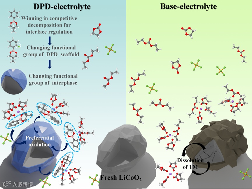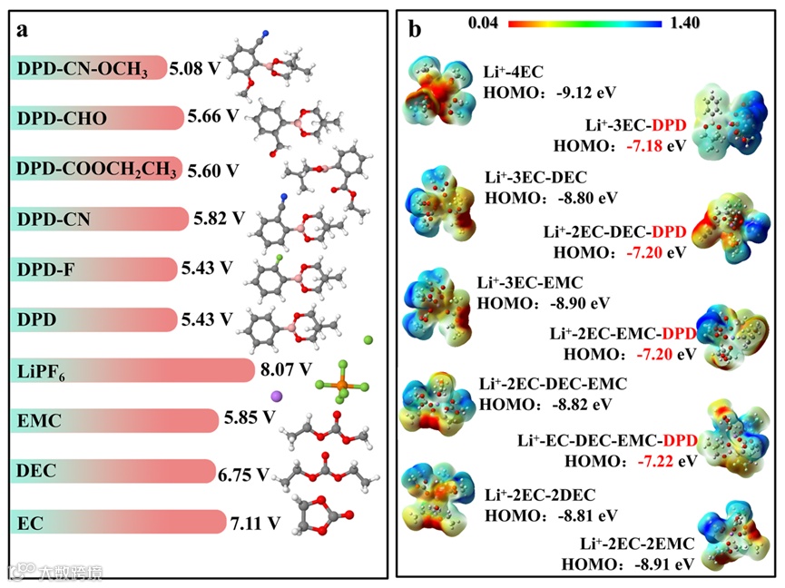 电极界面的形成过程是一种溶剂分子和锂盐阴离子之间的竞争性的电化学反应。而理论计算研究是预测这场激烈的界面占据竞赛的重要判断方式之一。该文章分析了DPD骨架具有极低的氧化电位,这意味着它相比于EC,EMC,DEC和LiPF6更容易失去电子。虽然不同的官能团的引入后,DPD骨架的氧化电位发生了轻微的浮动。但是依然低于电解液中的任何一种成分。这意味着DPD化合物很适合作为构筑正极界面的基础骨架。而通过修改骨架化合物的官能团,将不同性质的官能团引入界面成为了可能。