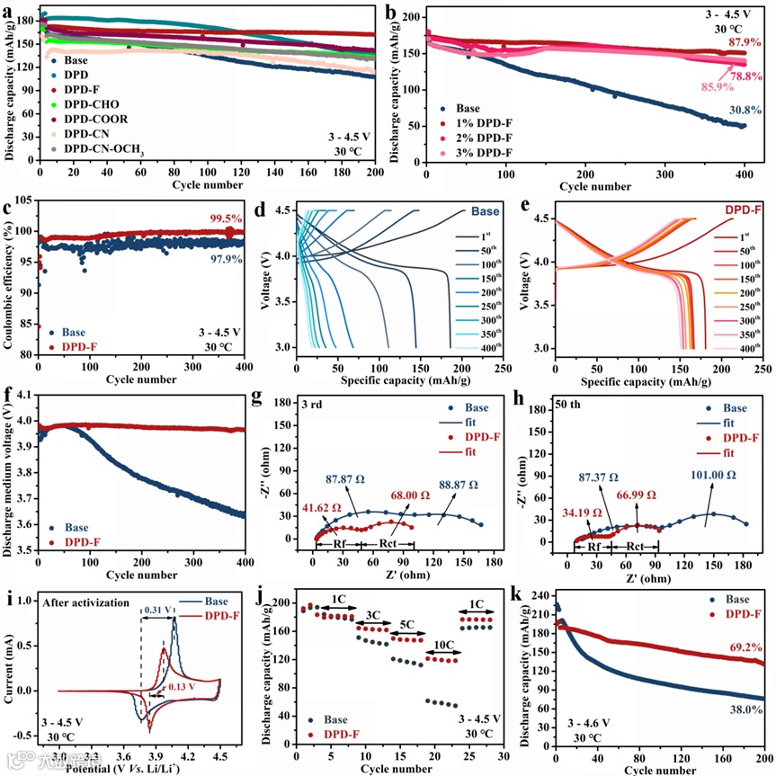 图3. (a)不同官能团修饰的DPD类化合物对Li/LCO电池循环性能的影响。(b)不同浓度的DPD-F对Li/LCO电池循环性能的影响。(c)对应的库伦效率。(d)在商用电解液中的充放电曲线。(e)在DPD-F电解液中的充放电曲线。(f)对应的放电中压。(g)循环3次后的Li/LCO电池的阻抗。(h)循环50次后的Li/LCO电池的阻抗。(i)活化后的Li/LCO电池的循环伏安测试曲线。(j)倍率性能。(k)4.6 V高电压性能。