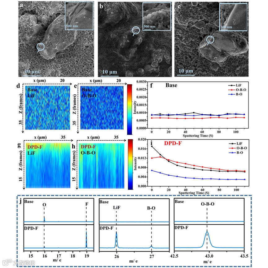 图5. (a)未经循环的LCO电极的扫描电镜图。(b)在商用电解液中循环过后的LCO电极的扫描电镜图。(c)DPD-F电解液中循环过后的LCO电极的扫描电镜图。(d, e, f, g, h, i, j)相应的TOF数据图。