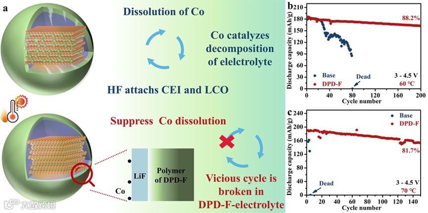 图4. (a)DPD-F界面打破过渡金属破坏电解液的恶性循环(b)Li/LCO电池在60 ℃时的循环性能。(c)Li/LCO电池在70 ℃时的循环性能。