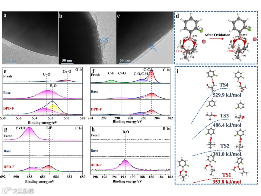 图6. (a)未经循环的LCO电极的透射电镜图。(b)在商用电解液中循环过后的LCO电极的透射电镜图。(c)DPD-F电解液中循环过后的LCO电极的透射电镜图。(d)DPD-F失去一个电子前后的结构示意图。(e, f, g, h)相对的XPS数据。(i)DPD-F不同的氧化分解所需跨越的能垒。