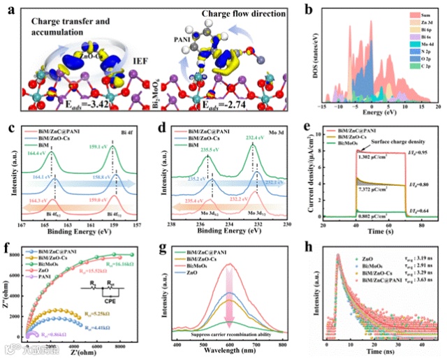 Fig. 3. The charge density difference of interface. Blue and yellow indicate charge accumulation and depletion, respectively (a); PDOS of the optimized configurations of BiM/ZnC@PANI (b); XPS spectra and fitting curves of Bi 4f (c) and Mo 3d (d); The surface charge density (e), EIS Nyquist plots (f), PL characterizations (g) and TRPL (h) spectroscopy of catalysts. Copyright 2023, Elsevier Inc.
