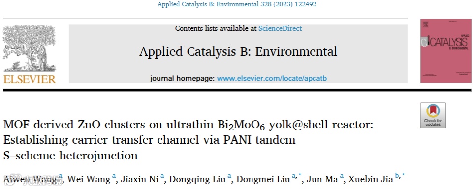 基于此,哈尔滨工业大学刘冬梅教授团队在国际催化领域顶级期刊Applied Catalysis B: Environmental发表了题为“MOF derived ZnO clusters on ultrathin Bi2MoO6 yolk@shell reactor: Establishing carrier transfer channel via PANI tandem S–scheme heterojunction”的研究论文。