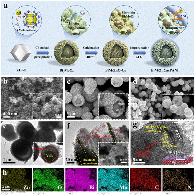 Fig. 1. Synthesis schematic illustration of BiM/ZnC@PANI yolk@shell reactor (a); SEM images of ZIF− 8 (b), BiM/ZnO−Cs (c) and BiM/ZnC@PANI (d); TEM and HR–TEM images of BiM/ZnC@PANI yolk@shell reactor (e–g), and element mapping (h) of BiM/ZnC@PANI (Zn, O, Bi, Mo, C and N). Copyright 2023, Elsevier Inc.