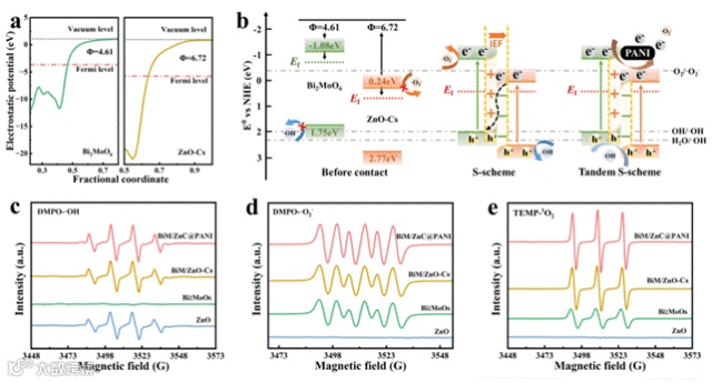 Fig. 4. Electrostatic potentials of Bi2MoO6 and ZnO (a); S–scheme transfer mechanism with PANI high speed charge transfer channel (b); EPR signals for DMPO–∙OH (c), DMPO–∙O2− (d) and TMPO–1O2 (e). Copyright 2023, Elsevier Inc.