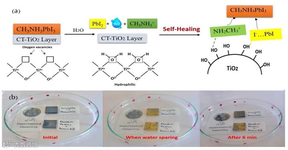 图1. (a) 模板化TiO2表面自修复机制 (b) 在修复测试中的钙钛矿膜