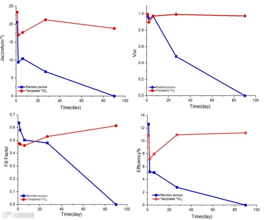 图2. 在常温环境(25-30°C,相对湿度30%至45%)下,在90天内测量标准TiO2和模板TiO2基CIS-PSCs的光伏参数稳定性。显示Jsc,Voc,FF和效率的演变。