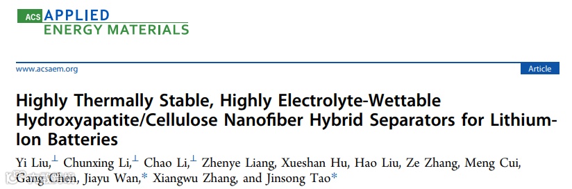 针对以上问题,华南理工大学陶劲松副研究员课题组和南方科技大学万佳雨副教授课题组在ACS Applied Energy Materials期刊上发表了题为“Highly Thermally Stable, Highly Electrolyte-Wettable Hydroxyapatite/Cellulose Nanofiber Hybrid Separators for Lithium-Ion Batteries”的研究论文。
