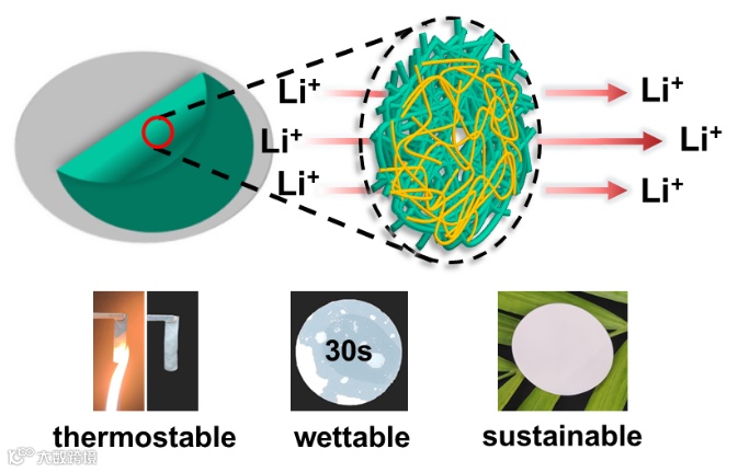 隔膜对锂离子电池的安全性和性能有着重要的影响。但是,传统的聚烯烃隔膜存在着热稳定性差和电解液浸润性差的问题,而目前常见的解决方案(一、改性现有商用隔膜;二、利用耐热聚合物制备隔膜)并不能完全解决上述问题;且仍然依赖于合成的、难以降解的聚合物,在制备过程中也难以避免使用有机溶剂,这些因素都不利于电池的回收。因此,有必要开发一种高耐热、高浸润性且环保的隔膜。
