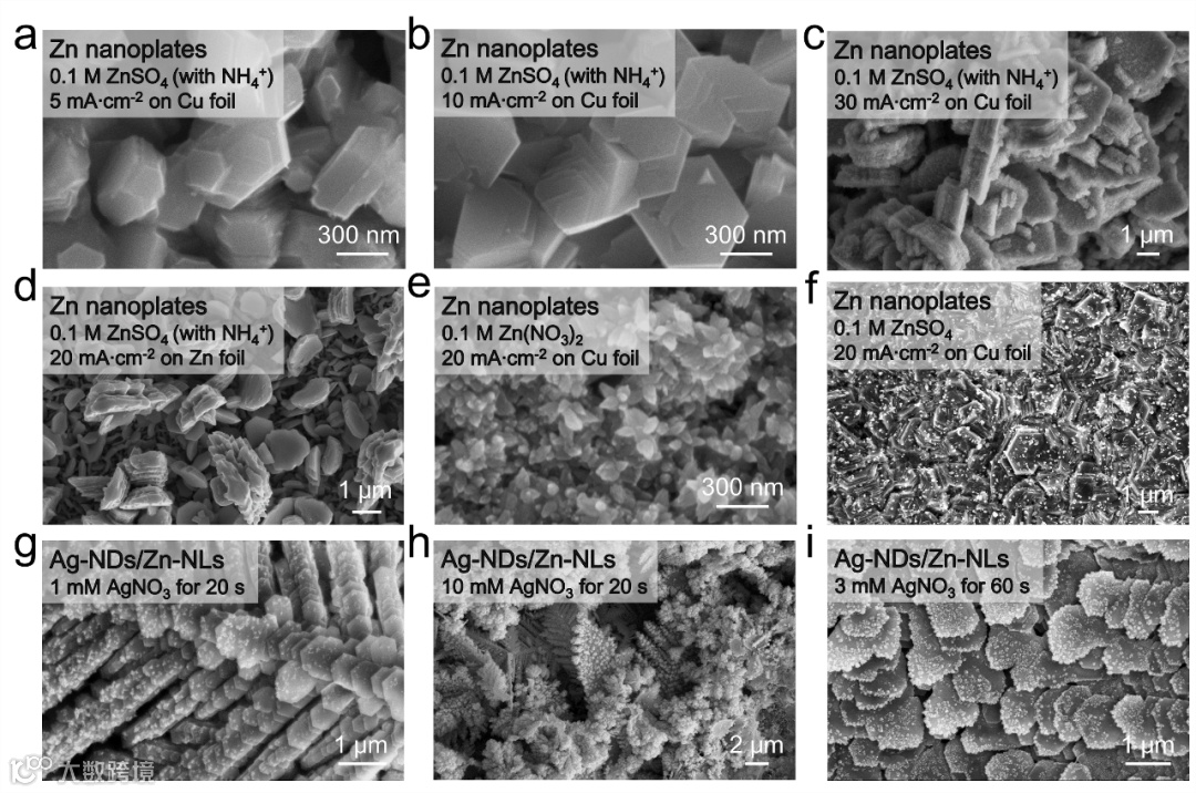 图3在不同条件下电沉积的Zn纳米结构的SEM图像:(a-c)在(a)5 mA·cm2、(b)10 mA·cm2、(c)30 mA·cm2的电流密度下于0.1 M ZnSO4和1.5 M (NH4)2SO4混合溶液中电沉积5分钟后Cu箔上生长的Zn纳米结构;(d)在20 mA·cm2的电流密度下于0.1 M ZnSO4和1.5 M (NH4)2SO4混合溶液中电沉积5分钟后Zn箔上生长的Zn纳米结构;(e)在20 mA·cm2的电流密度下于0.1 M Zn(NO3)2溶液中电沉积5分钟后Cu箔上生长的Zn纳米结构;(f)在20 mA·cm2的电流密度下于0.1 M ZnSO4溶液中电沉积5分钟后Cu箔上生长的Zn纳米结构;(g-i)不同条件下由Ag-NDs修饰的Zn-NLs的SEM图像:将Zn-NLs在(g)1 mM AgNO3溶液中浸泡20 s,(h)10 mM AgNO3溶液中浸泡20 s,(i)1 mM AgNO3溶液中浸泡60 s后的SEM的图像。