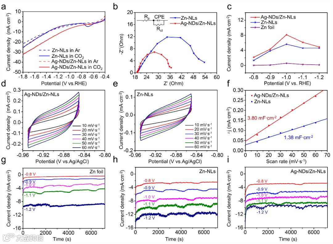 图4(a)ZnNLs和AgNDs/ZnNLs在饱和CO2或Ar后的0.1 M KHCO3电解液中测得的LSV曲线;(b)ZnNLs和AgNDs/ZnNLs的尼奎斯特曲线;(c)不同电位下Zn箔、Zn-NLs和AgNDs/ZnNLs的2h平均CO部分电流密度;(d-e)在Ar饱和后的0.1 M KHCO3电解液中测得(d)Ag-NDs/Zn-NLs与(e)Zn-NLs的CV曲线;(f)Ag-NDs/Zn-NLs和Zn-NLs的充电电流密度差(Δj)与扫速的相关图;(g-i)不同电位下(vs. RHE,经过欧姆补偿)在CO2饱和的0.1 M KHCO3电解液中测得的2小时内随时间变化的(g)Zn箔的,(h)Zn-NLs的,(i)Ag-NDs/Zn-NLs的电流密度曲线。