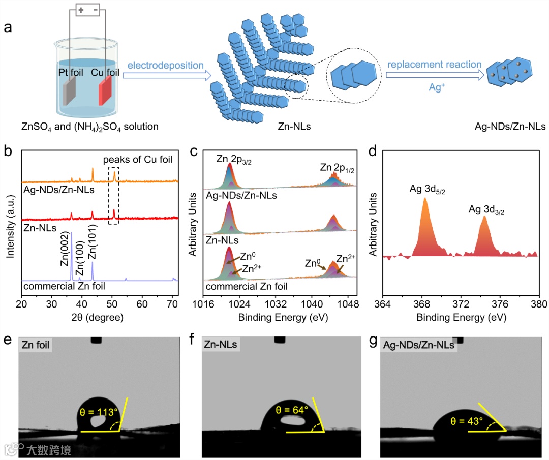 图1(a)ZnNLs和AgNDs/ZnNLs在铜箔上的合成过程示意图;(b)Zn 箔、ZnNLs和AgNDs/ZnNLs的XRD图;(c)Zn箔、ZnNLs和AgNDs/ZnNLs的Zn 2p XPS能谱;(d)AgNDs/ZnNLs的Ag 3d XPS能谱,所有XPS结果均已根据284.6 eV处的标准C 1s信号进行了校正;(e)Zn 箔、(f)ZnNLs和(g)AgNDs/ZnNLs与去离子水的接触角。