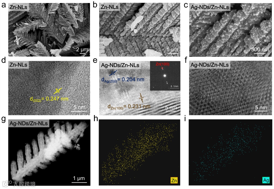 这种ZnNLs的鱼鳞状纳米结构由许多规则组装的 Zn 纳米片组成(图 2a和2b)。在浸入稀释的 AgNO3溶液后,超细AgNDs在Zn纳米片上分散生长(图 2c)。AgNDs/ZnNLs的摩尔纹可以在图2f 中被清楚地识别。这些摩尔纹是由一层薄层 ZnO和Zn之间的晶格条纹重叠造成的。而这种ZnO层是由Zn在空气中自氧化形成的,它阻止了Zn的进一步氧化。