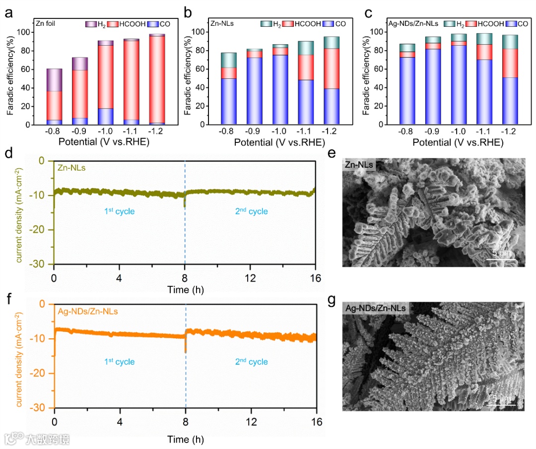 图5(a-c)在CO2 饱和的0.1 M KHCO3水溶液中不同电位(经过欧姆补偿)下进行2小时CO2还原后的(a)Zn箔、(b)ZnNLs 和(c)AgNDs/ZnNLs的不同还原产物的法拉第效率;(d)ZnNLs在1.0 V(vs. RHE,经过欧姆补偿)的电位下进行16小时长期CO2RR测试期间的电流密度;(e)16小时CO2RR测试后ZnNLs的SEM图像;(f)AgNDs/ZnNLs在1.0 V(vs. RHE,经过欧姆补偿)的电位下进行16小时长期CO2RR测试期间的电流密度;(g)16小时CO2RR测试后AgNDs/ZnNLs的SEM图像。