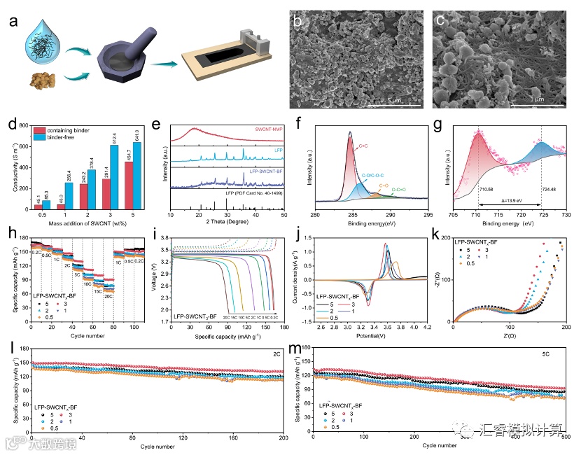 图4:a)通过浇铸法制备阴极的工艺示意图。b、c) LFP-SWCNTx-BF的SEM图像。d)有和没有PVDF粘合剂的阴极的电导率。e)SW CNT-NMP、LFP和LFP-SWCNT-BF的XRD。LFP-SWCNT3-BF的XPS高分辨率f) C 1s和g) Fe 2p谱。h)倍率性能。i)LFP-SW CNT3-BF的恒电流充放电(GCD)曲线。j)扫描0.2 mV s-1时的CV曲线。k)奈奎斯特图。在(l)2C和(m)5C下的循环性能。