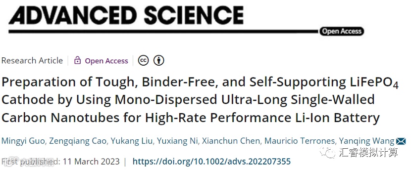 低含量/无非电化学活性粘结剂、导电添加剂和集流体一直是提高锂离子电池快速充放电性能和开发柔性/可穿戴电子设备自支撑电极所关注的问题。在此,四川大学王延青特聘研究员课题组,在国际纳米领域知名期刊Advanced Science 上发表题为“Preparation of Tough, Binder-Free, and Self-Supporting LiFePO4 Cathode by Using Mono-Dispersed Ultra-Long Single-Walled Carbon Nanotubes for High-Rate Performance Li-Ion Battery”的研究论文,报道了一种简单而有效的制备方法,利用分散剂分子的静电偶极子相互作用和空间位阻,在N-甲基吡咯烷酮(NMP)溶液中大量制备单分散的超长SWCNT。经过分散的SWCNT可以在电极制备过程中形成高效的导电网络,即使0.5wt%的添加量都可以将LiFePO4(LFP)颗粒牢牢固定在电极上。通过该方法得到的无粘结剂正极在0.5C和5C时的容量分别为161.5 mAh g-1和130.2 mAh g-1,在2C循环200次后的容量保持率为87.4%。在去掉集流体后得到的自支撑电极表现出优异的力学性能,可以承受至少7.2 MPa的应力和5%的应变,可得到高达39.1 mg cm-2的质量载量的超厚电极。通过SWCNT构建的自支撑电极的电导率高达1197 S m−1,低电荷转移电阻为40.53 Ω,实现了快速的电荷传递并接近理论的比容量。