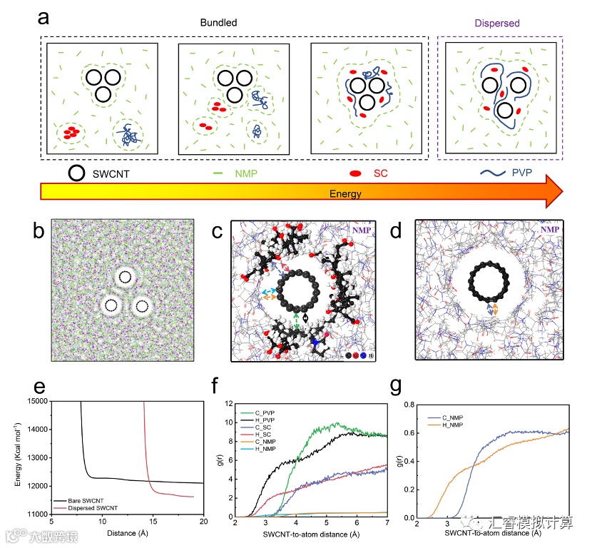 图2:a)使用分散剂将成束的CNT分解成单独分散的纳米管的过程的示意图。b)分子动力学模拟中的原子模型以及NMP溶液中的原子与c)分散的SWCNT和d)裸露的SWCNT的表面之间的距离。e)在SWCNT彼此接近期间,相互作用能量发生变化。f)分散的SWCNT和g)裸露的SWCNT的碳、氢原子的RDF。