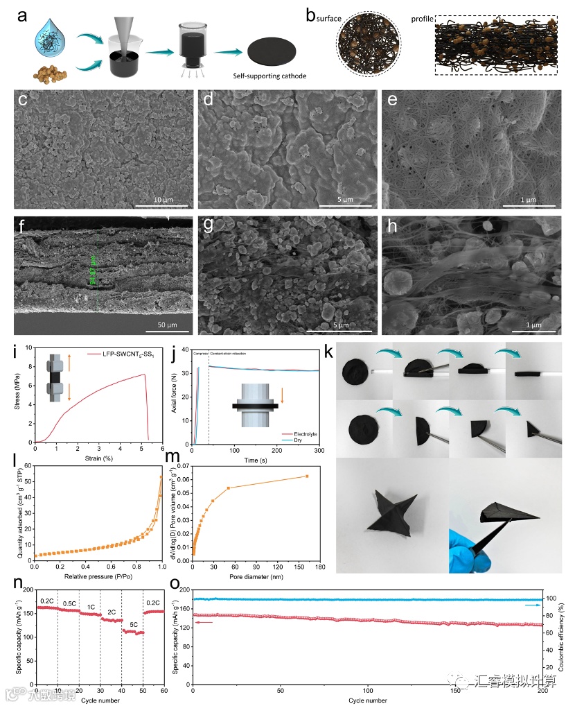 图5:a)真空过滤自支撑阴极示意图。b)自支撑阴极的表面和轮廓的结构图。c–e)LFP-SW CNT5-SS的表面和f–h)横截面的SEM图像。i)应力-应变曲线。j)压缩和松弛条件下的微环境稳定性试验。k)弯曲性能试验。l) N2吸附/解吸等温线和m)孔径分布。n)倍率和o)循环性能。