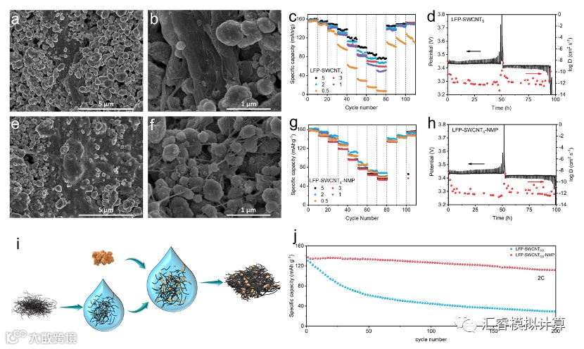 图3:a,b)LFP-SW CNT5的SEM图像。c) LFP-SWCNTx的倍率性能。d)来自LFP-SWCNT5的GITT曲线。e,f)LFP-SWCNT5-NMP的SEM图像。g)LFP- SWCNTx-NMP的倍率性能。h)从LFP到NMP的GITT曲线。I)阴极制备过程中微观示意图。j)当x = 0.5时,在2 C下,由粉末和分散体制备的阴极的循环性能的比较。