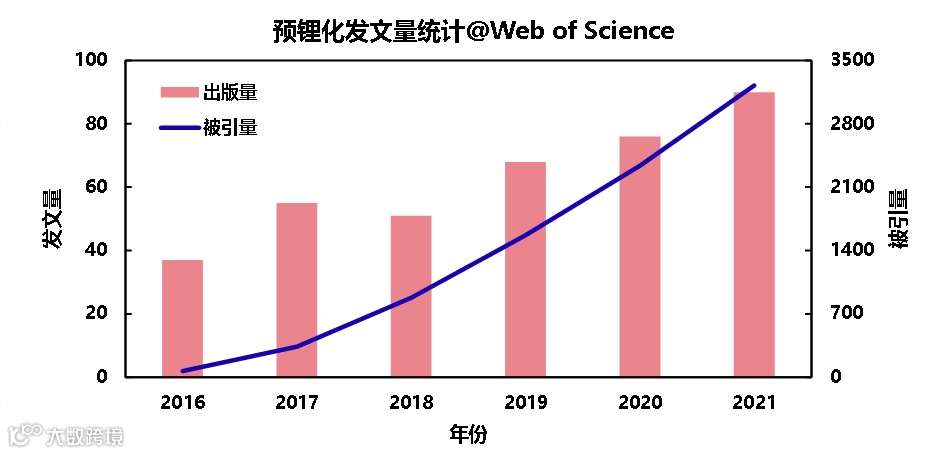 图1. 2016至2021年Web of Science预锂化相关论文发文量/被引量年度分布