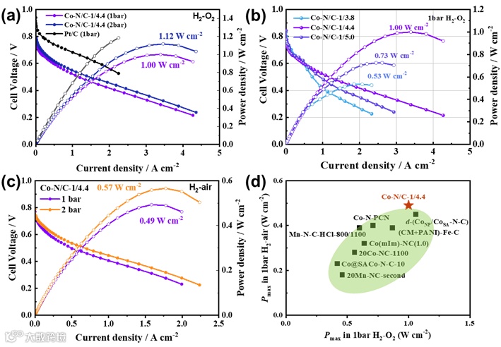 进一步组装膜电极以评估燃料电池性能。阴极Co-N/C催化剂载量为3.5 mg cm-2,2bar H2-O2燃料电池峰值功率密度达到1.12 W cm-2,2bar H2-air燃料电池峰值功率密度达到0.57 W cm-2,是目前Co基催化剂中燃料电池性能最高的催化剂。