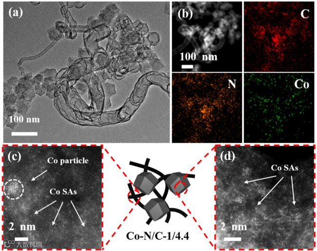 图2 Co-N/C-1/4.4的形貌表征。(a) TEM, (b) EDX mapping, (c-d) HAADF-AC-STEM