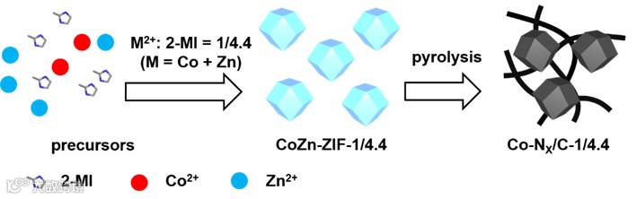 通过控制前体溶液中2-MI的浓度,实现碳纳米管的原位生长 (图1)。前体溶液中2-MI浓度的增加导致在初始阶段形成更多的晶种,并且在随后的晶体生长过程中消耗更多的金属离子更快。然而,溶液中金属离子浓度的快速降低会抑制生成的ZIF晶体的进一步生长,从而减小生成的CoZn-ZIF前驱体的平均粒径。