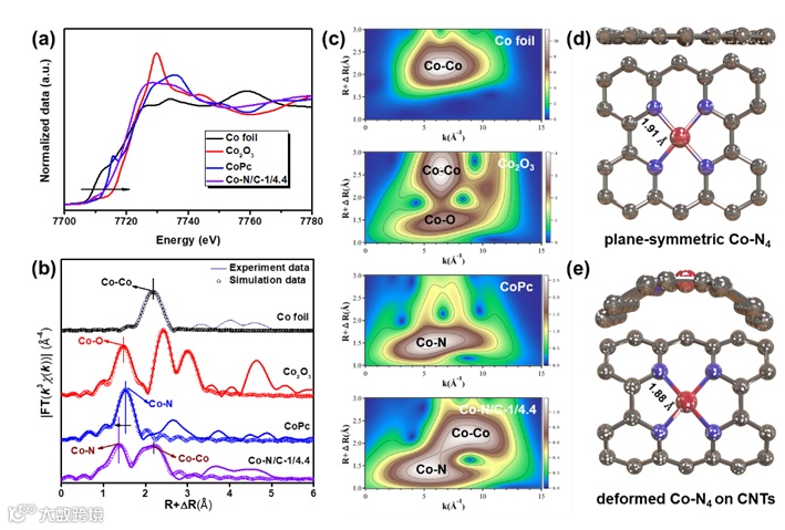 图3 Co-N/C-1:4.4的配位环境。(a) XANES, (b) FT-EXAFS, (c)小波变换, (d) 平面对称Co-N4 结构和 (e) 变形的Co-N4结构