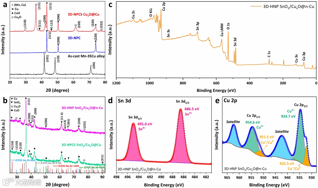 图3. a)铸态Mn-35Cu合金、3D-NPC和3D-NPCS CuxO@Cu复合材料,(b) 3D-NPCS SnO2/CuxO@Cu和3D-HNP SnO2/CuxO@n-Cu电极的XRD谱图。c) XPS测量光谱,d,e) 3D-HNP SnO2/CuxO@n-Cu电极的Sn 3d和Cu 2p的高分辨率XPS光谱。