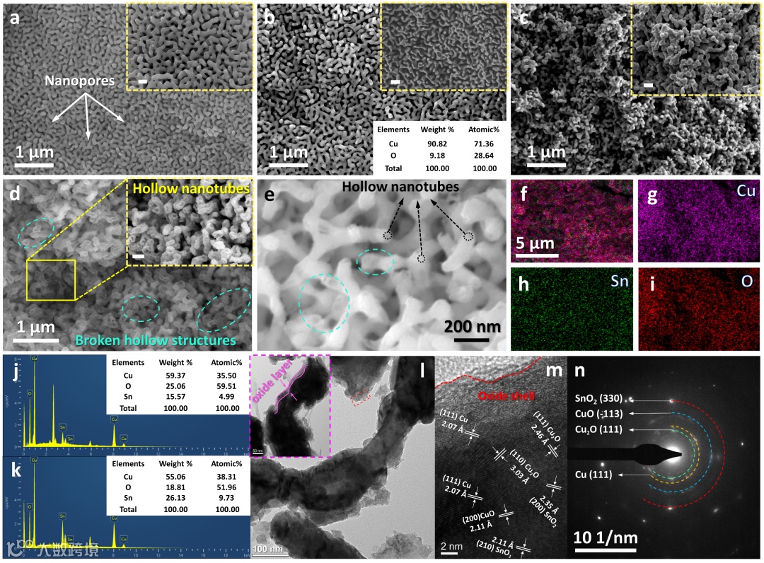 图2. SEM图像:a)将Mn-35Cu(at%)合金切片在质量分数为5% H2SO4溶液中在室温下化学去合金化48 h得到的3D-NPC,b)将3D-NPC在170℃空气中热处理20 min制得的3D-NPCS CuxO@Cu复合材料,c)在0.7 g L−1 SnCl4·5H2O+100g L−1 NaCl和乙醇的混合溶液中,将3D-NPCS CuxO@Cu复合材料在室温下电化学置换2 h,制得的3D-NPCS SnO2/CuxO@Cu电极,d)3D-NPCS SnO2/CuxO@n-Cu电极在0.4 mol L−1 NH4Cl溶液中在室温下进行6天的选择性蚀刻得到的3D-HNP SnO2/CuxO@n-Cu电极,其中(a-d)部分的插图显示了高倍率SEM图像和相应的EDX结果。d部分是平面图,e部分是剖视图。插图中的比例尺(a-d):200 nm。f-i)3D-HNP SnO2/CuxO@n-Cu电极的EDX元素面扫图谱。J-k)3D-NPCS SnO2/CuxO@Cu和3D-HNP SnO2/CuxO@n-Cu电极的EDX图谱和结果。l) TEM图像,m) HRTEM图像,n) 3D-HNP SnO2/CuxO@n-Cu电极的SAED衍射花样,其中(l)部分的插图为单个空心纳米管的高倍TEM图像,红色虚线矩形对应(m)部分的HRTEM图像。