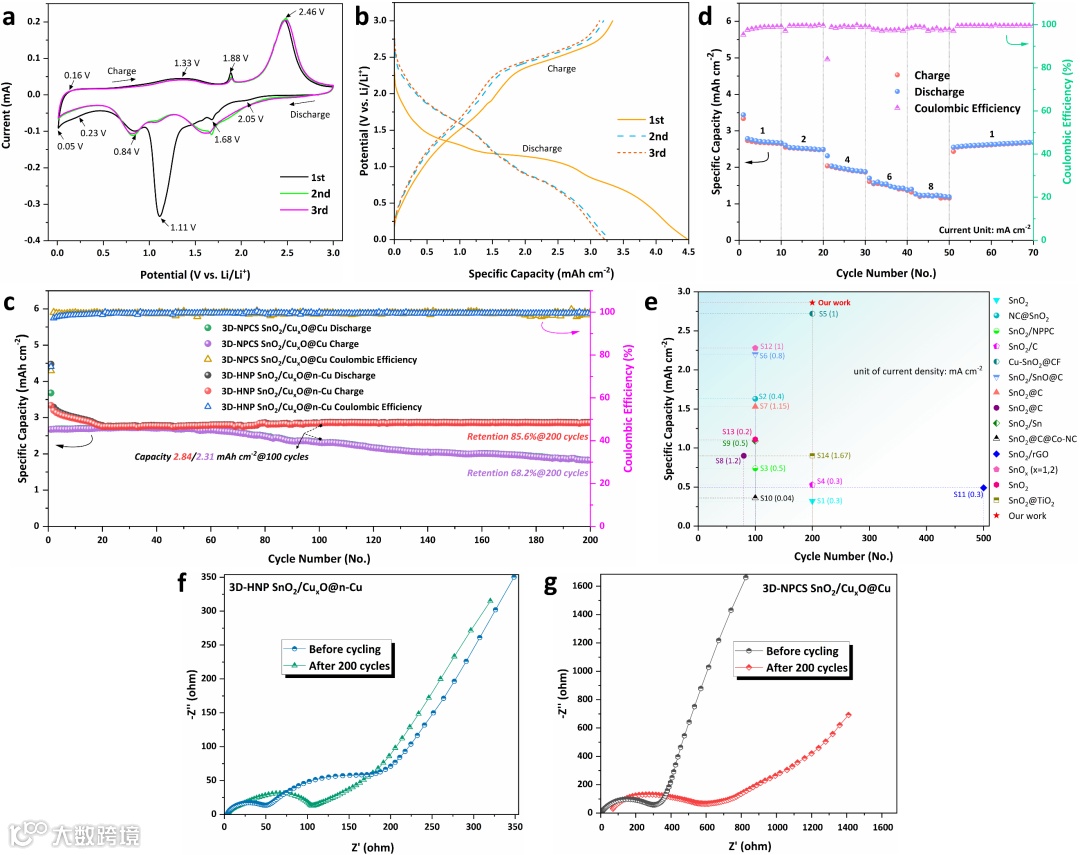 图4. a) 在扫描速度为0.1 mV s−1时,3D-HNP SnO2/CuxO@n-Cu电极前三个循环的CV曲线,电压窗口为0.01-3.0 V (vs Li/Li+)。b) 3D-HNP SnO2/CuxO@n-Cu电极在1 mA cm−2电流密度下的恒流充放电曲线。c) 3D-NPCS SnO2/CuxO@Cu和3D-HNP SnO2/CuxO@n-Cu电极在1 mA cm−2电流密度下的循环性能。d) 3D-HNP SnO2/CuxO@n-Cu电极在1、2、4、6、8 mA cm−2电流密度下的倍率能力。e) 近期文献报道的不同结构设计的各种SnOx基负极的储锂性能的详细比较(具体电化学性能数据见表S2,补充材料)。f,g) 3D-HNP SnO2/CuxO@n-Cu和3D-NPCS SnO2/CuxO@Cu电极在200次循环前后的Nyquist图。