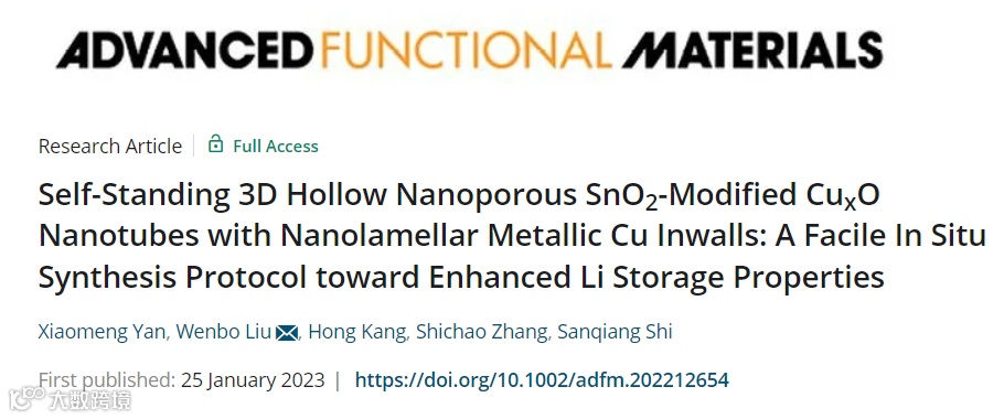 基于此,四川大学刘文博教授团队在国际知名期刊Advanced Functional Materials上发表题为“Self-Standing 3D Hollow Nanoporous SnO2-Modified CuxO Nanotubes with Nanolamellar Metallic Cu Inwalls: A Facile In Situ Synthesis Protocol toward Enhanced Li Storage Properties”的研究文章。