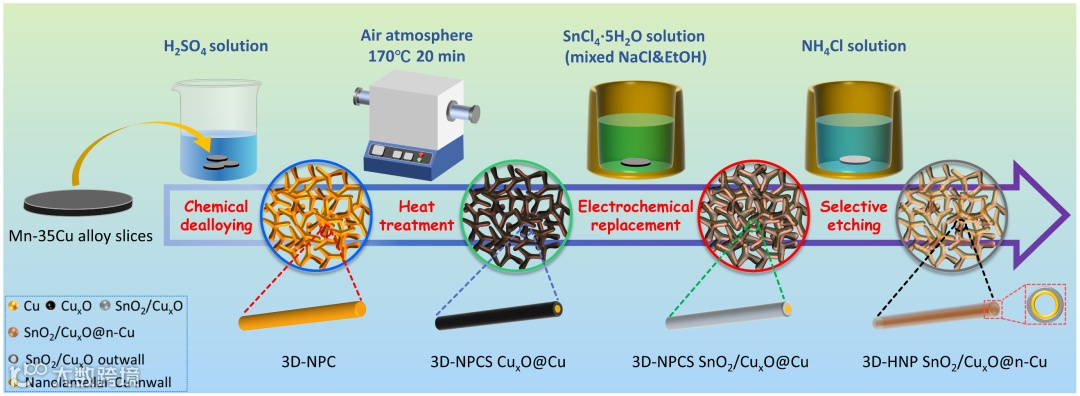 图1. 自支撑3D-HNP SnO2/CuxO@n-Cu的多步原位合成过程示意图。