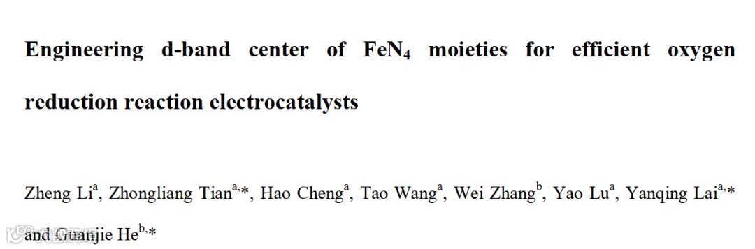 基于此,中南大学赖延清教授、田忠良教授和伦敦大学学院何冠杰教授,在国际知名期Energy Storage Materials上发表题为“Engineering d-band center of FeN4 moieties for efficient oxygen reduction reaction electrocatalysts”的研究论文。
