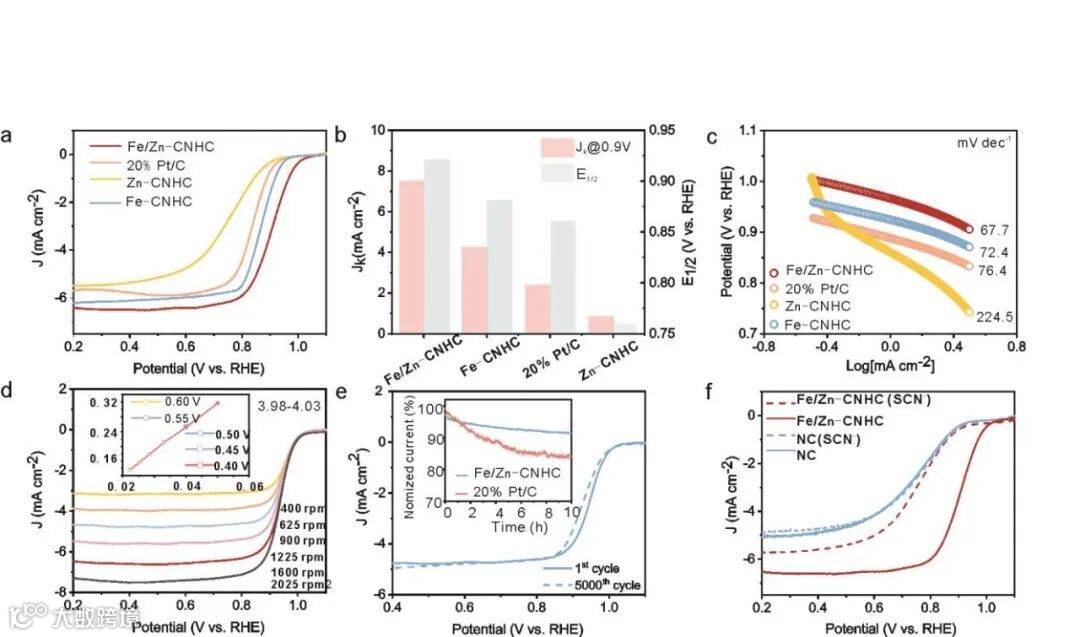 原子分散的Fe/Zn-CNHC催化剂在碱性介质中用于ORR( E1/2= 0.91 V)表现出优异的催化活性。此外,其在ORR过程中的出色稳定性可与贵金属催化剂(Pt/C)相媲美。