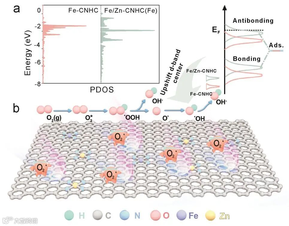Fig. 1 Design of the Fe/Zn-CNHC catalyst: (a) PDOS of Fe for Fe-CNHC and Fe/Zn-CNHC; (b) Reaction pathway of the Fe/Zn-CNHC catalyst.