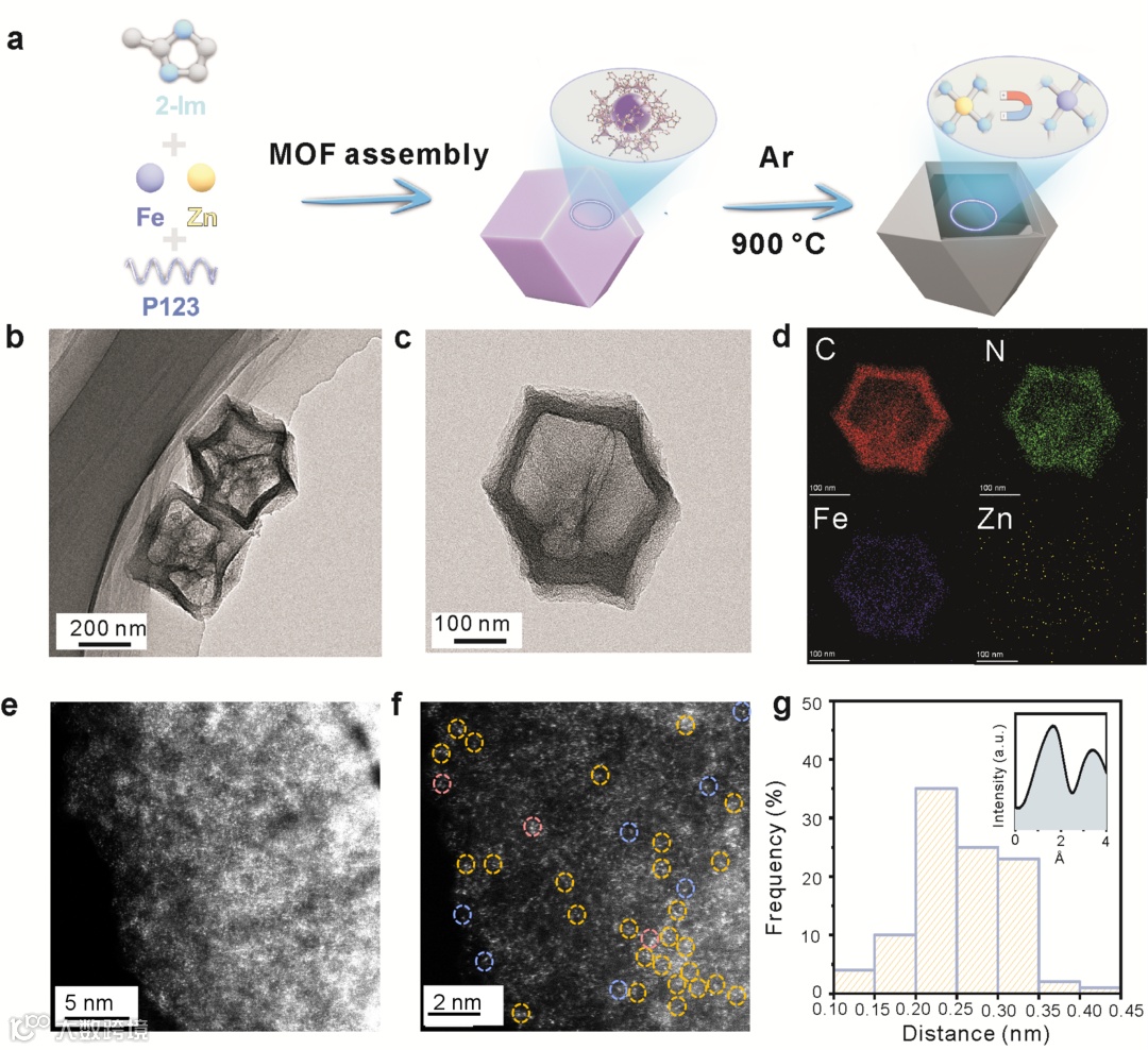 Figure 2. The microstructure characterization. (a) Schematic illustration for the synthesis process of Fe/Zn-CNHC catalyst; (b, c and d) TEM image and EDS element maps (Fe: orange, C: red, N: green, Zn: yellow) of Fe/Zn-CNHC at the pyrolysis temperature of 900 °C; (e and f) AC HAADF-STEM images of Fe/Zn-CNHC; (g) Statistical Fe/Zn distance in the observed diatomic pairs. Inset is the intensity profile obtained on bimetallic Fe/Zn sites.